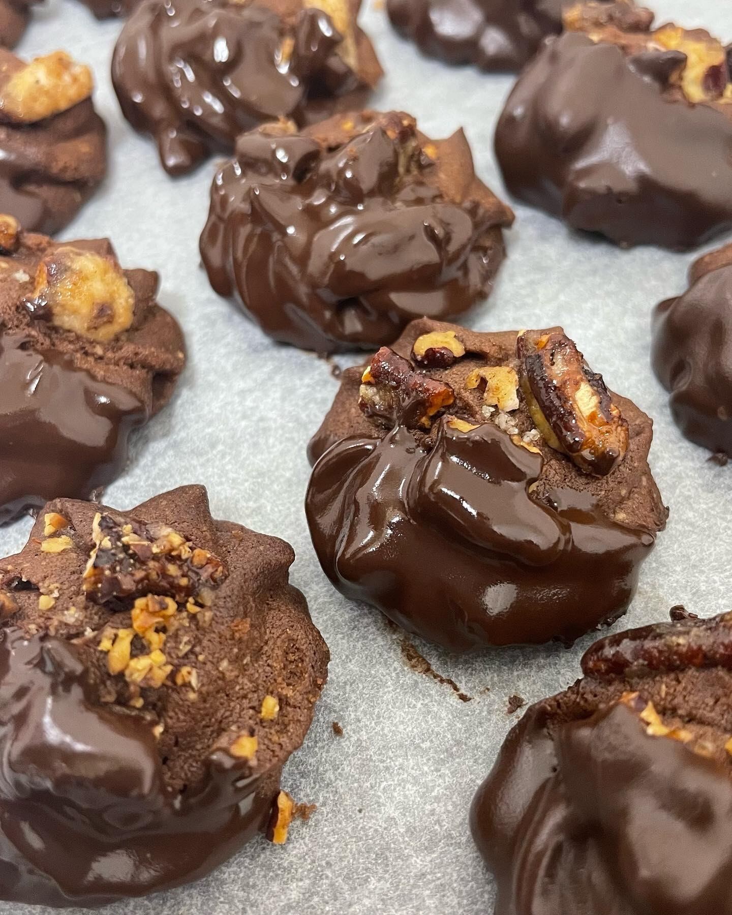 チョコレート生地にピーカンナッツのキャラメリゼとゲランドの塩をのせて焼き、仕上げにクーベルチュールチョコレートをコーティングしました。